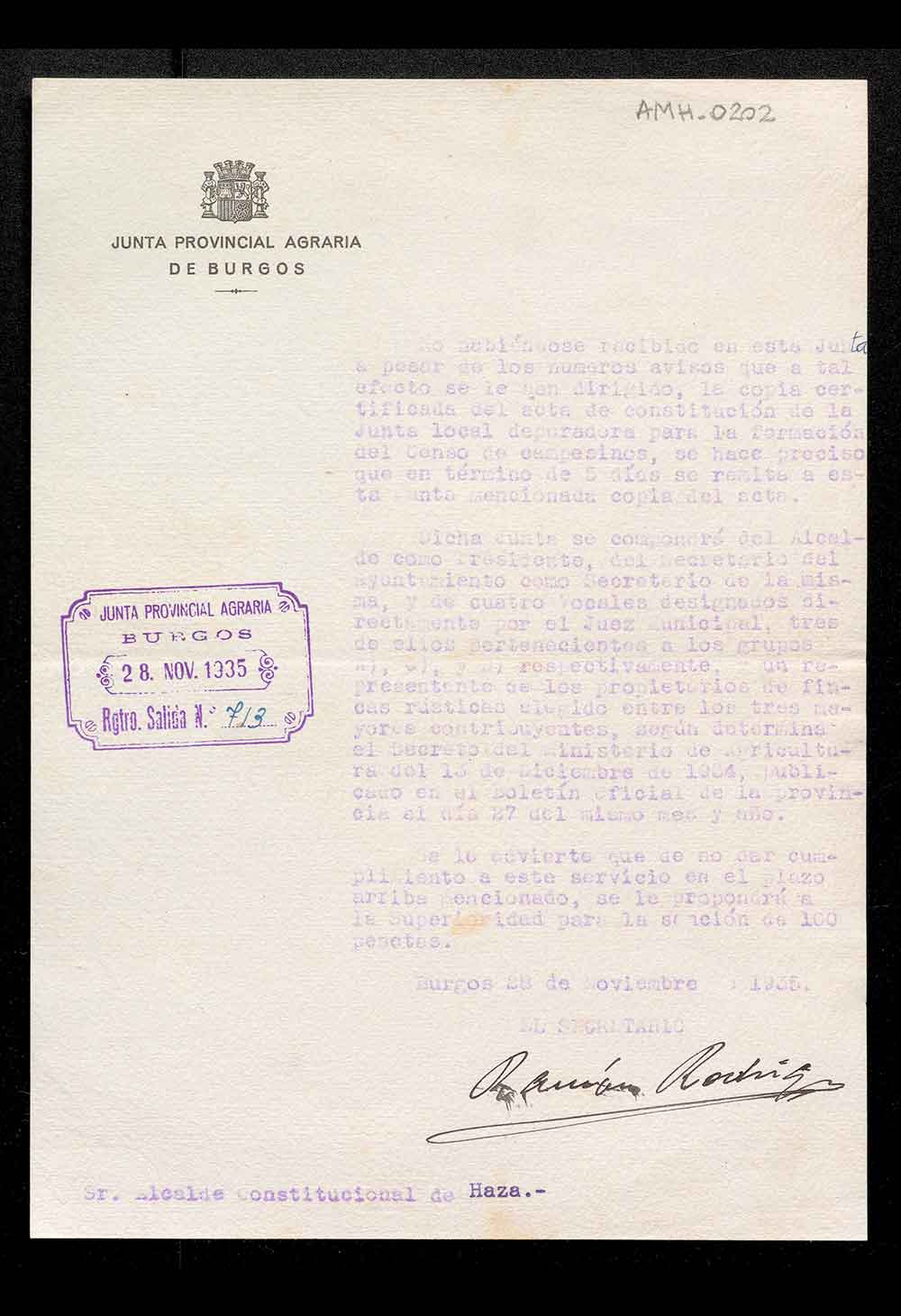 Carta de la Junta provincial agraria de Burgos al alcalde de Haza sobre la certificación del acta de constitución de la Junta local Depuradora.