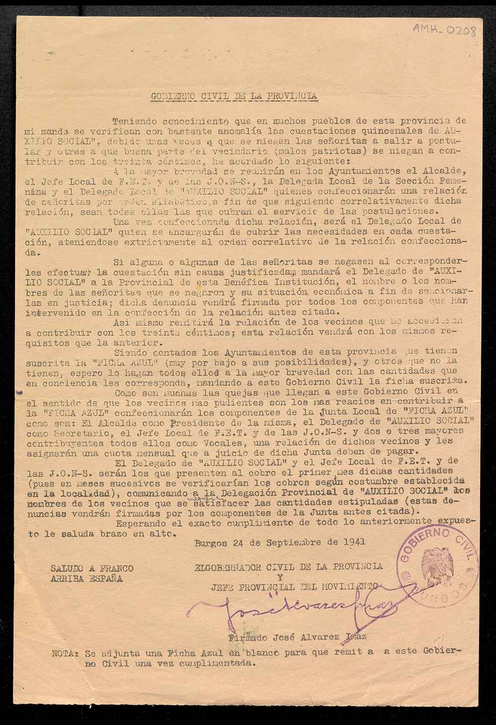 Carta del Gobierno Civil de Burgos a los ayuntamientos de esta provincia para cumplir con las obligaciones de auxilio social.