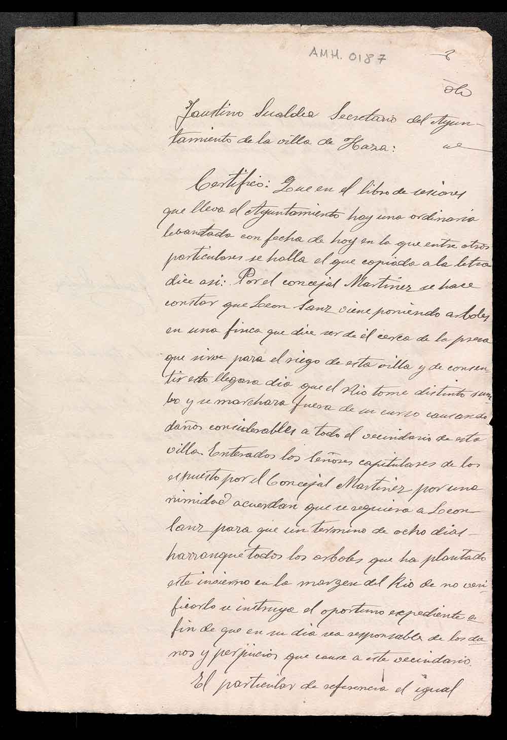 Certificado del Secretario de Haza sobre la plantación de árboles y cómo afectará al curso del río.