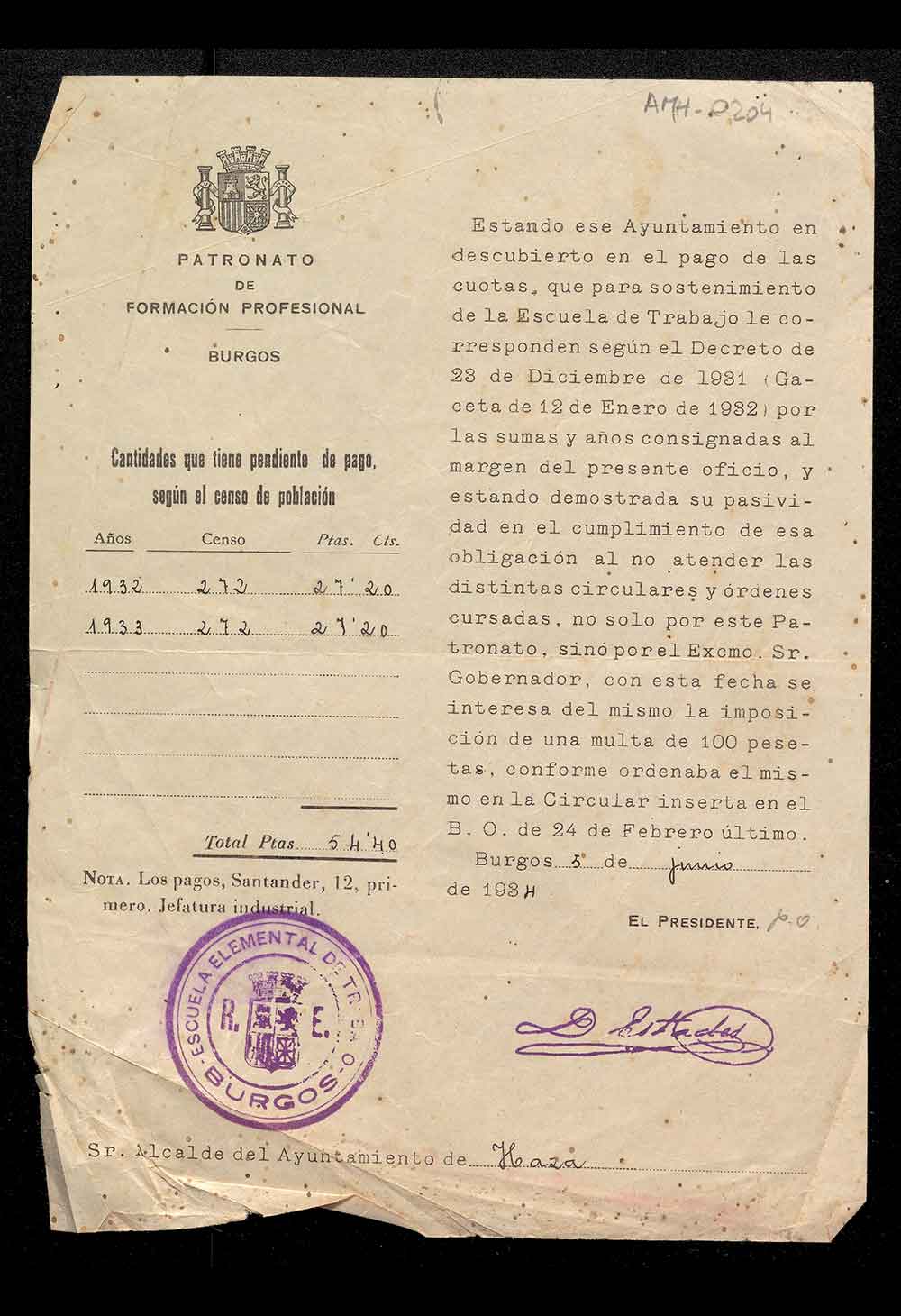 Comunicación de multa al Ayuntamiento de Haza del Patronato de Formación Profesional de Burgos.