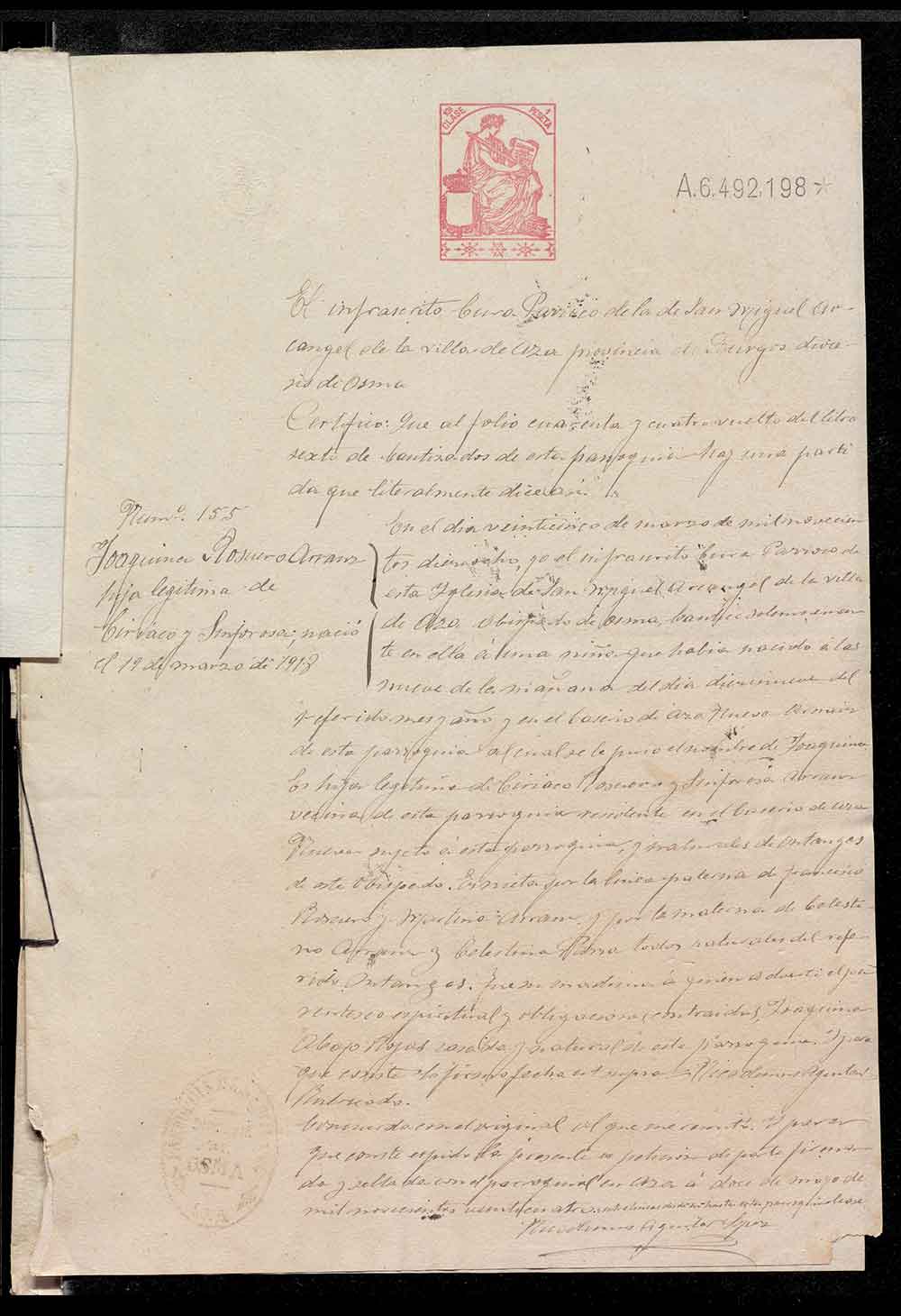 Expediente para inscribir el acta de nacimiento de Joaquina Rosuero Arranz que nació en 19 de marzo de 1918.