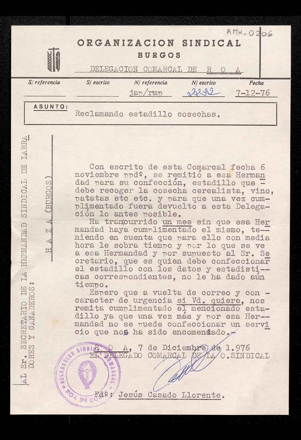 Solicitud de estadillo de cosecha a la Hermandad Sindical de Labradores y Ganaderos de Haza por parte de la organización sindical de Burgos.