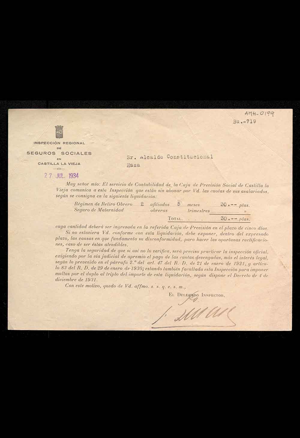 Solicitud para el abono de cuotas de asalariados de la inspección regional de seguros sociales en Castilla la Vieja al alcalde de Haza.